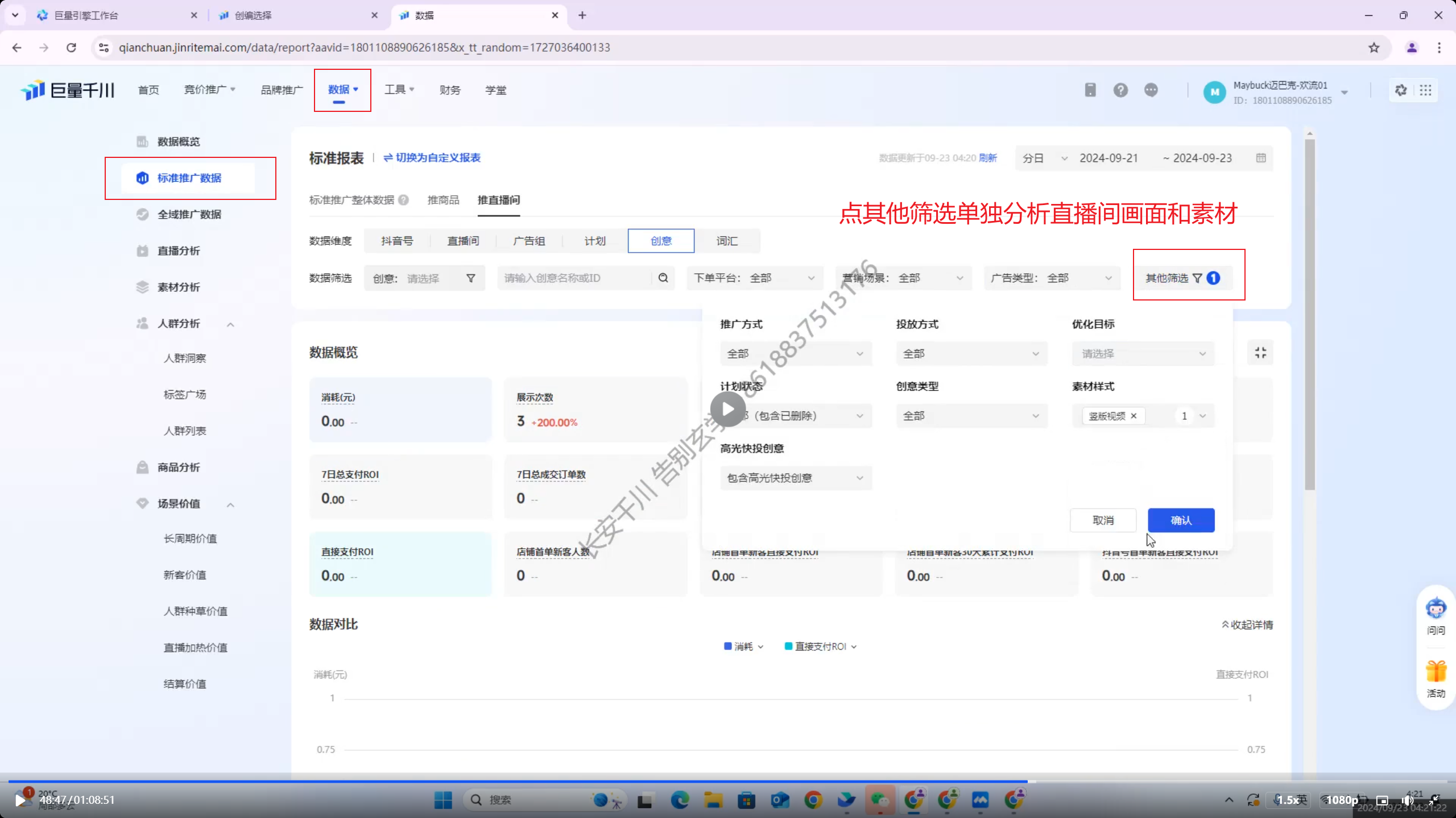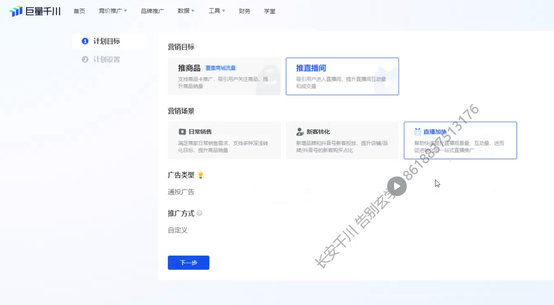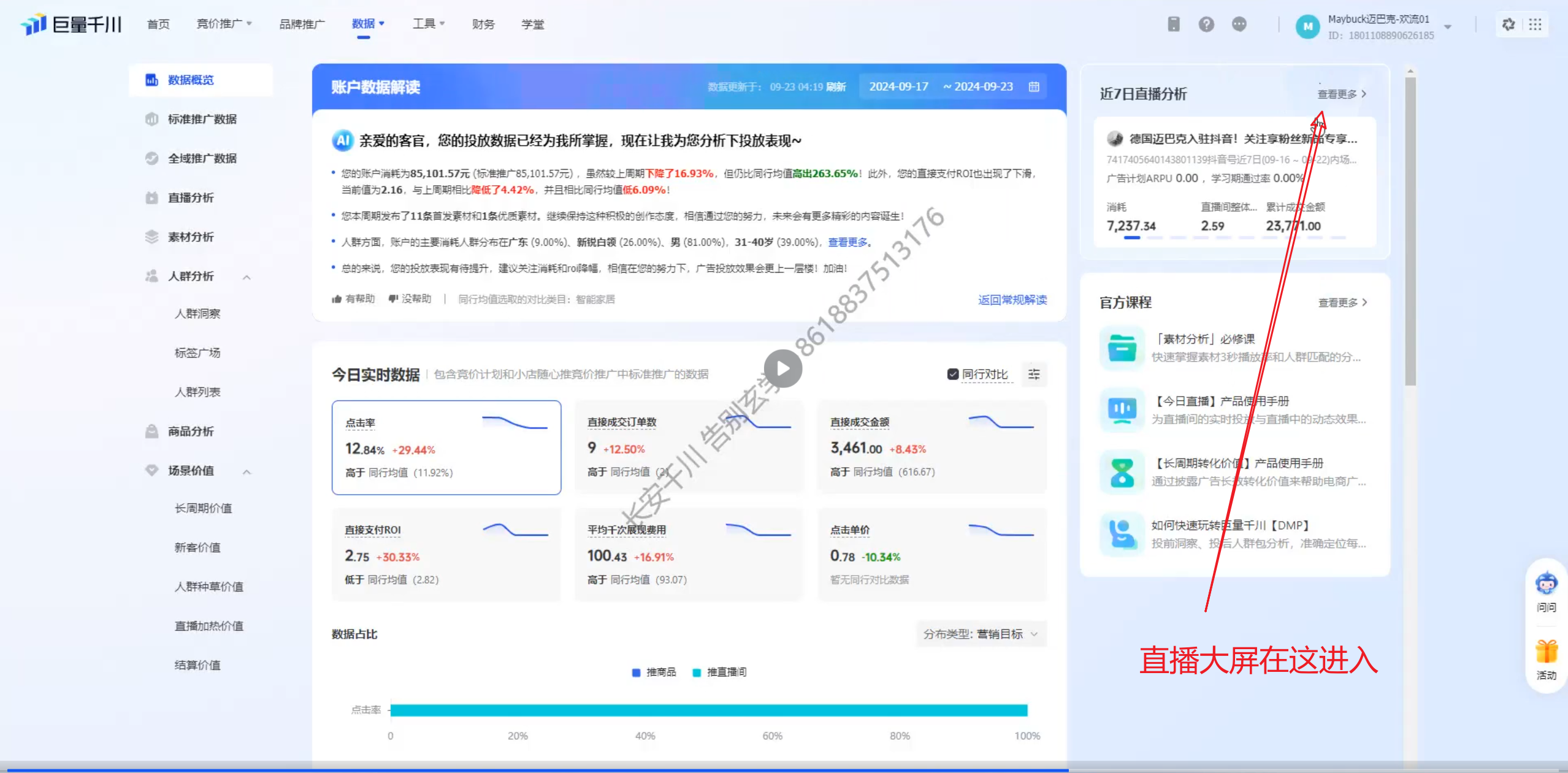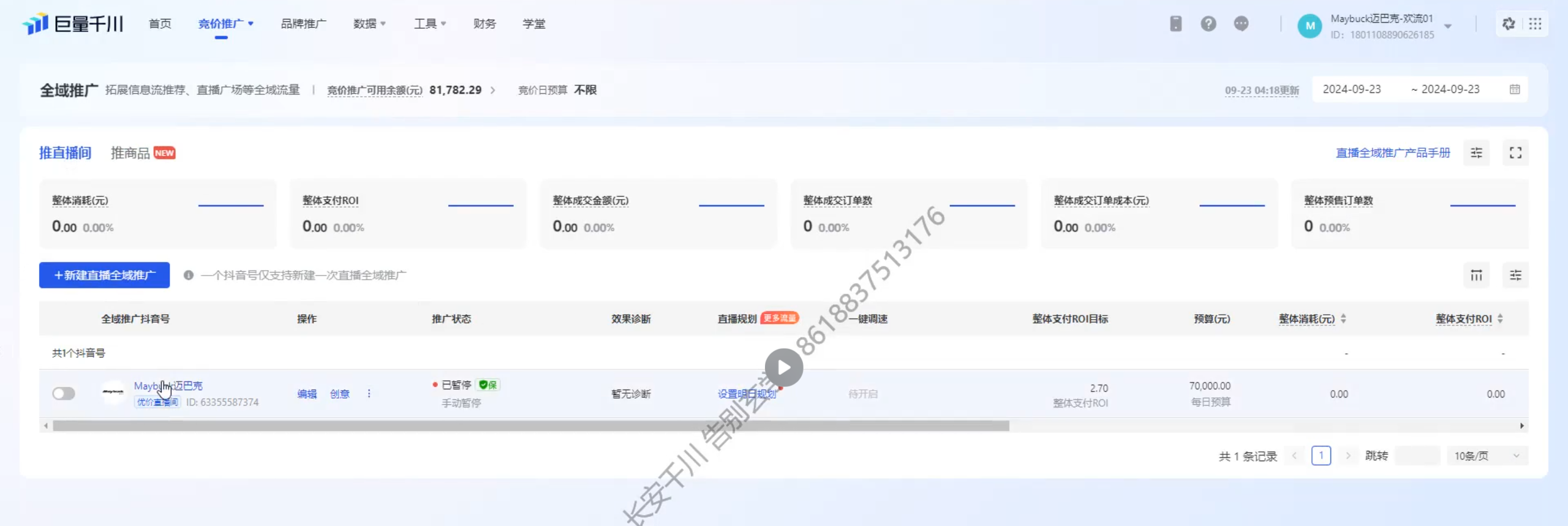 全域推广,无论推直播间或推商品,都只能建一条计划,其直播大屏在计划详情页内查看