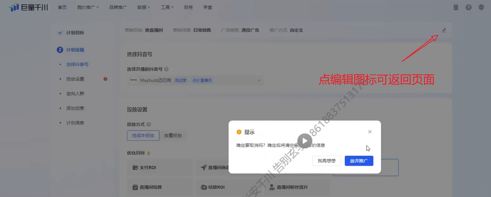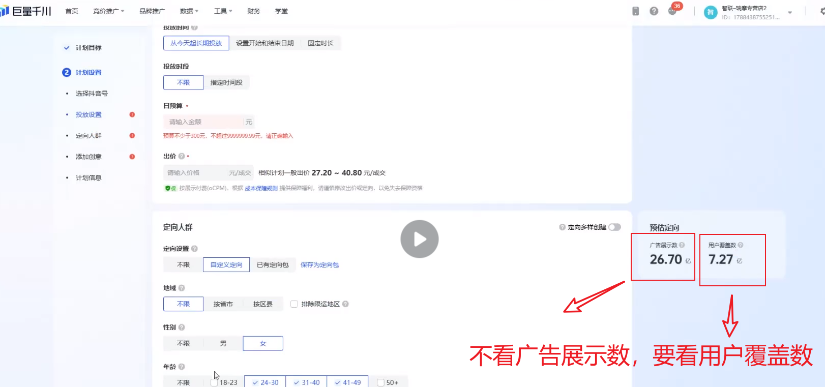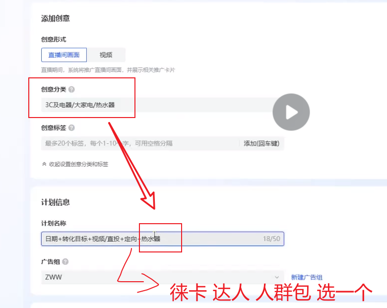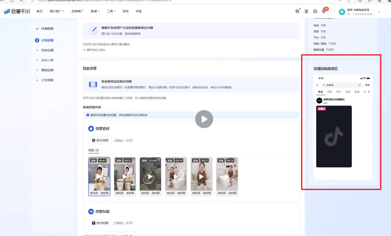 建计划过程中注意选择正确的开播抖音号,这是投手的大忌