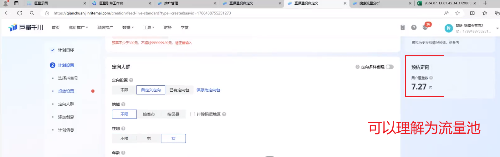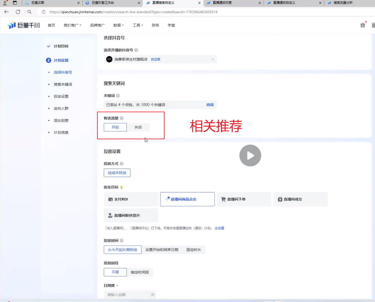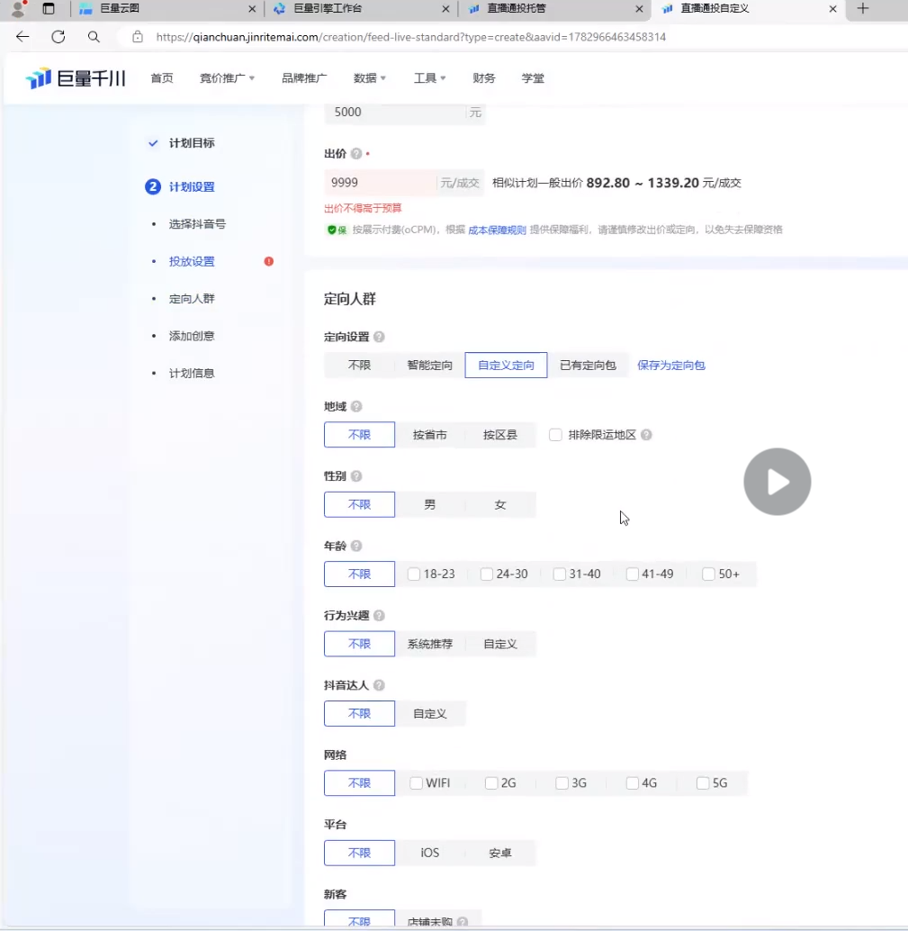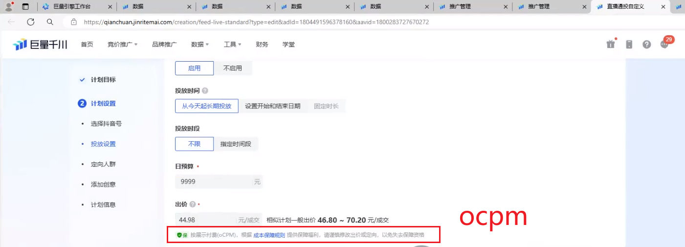 出价,后续会详细讲,右边是平台给出的参考,不一定要按照这个,看你直播间具体数据情况而定