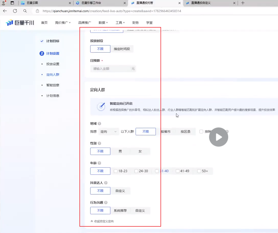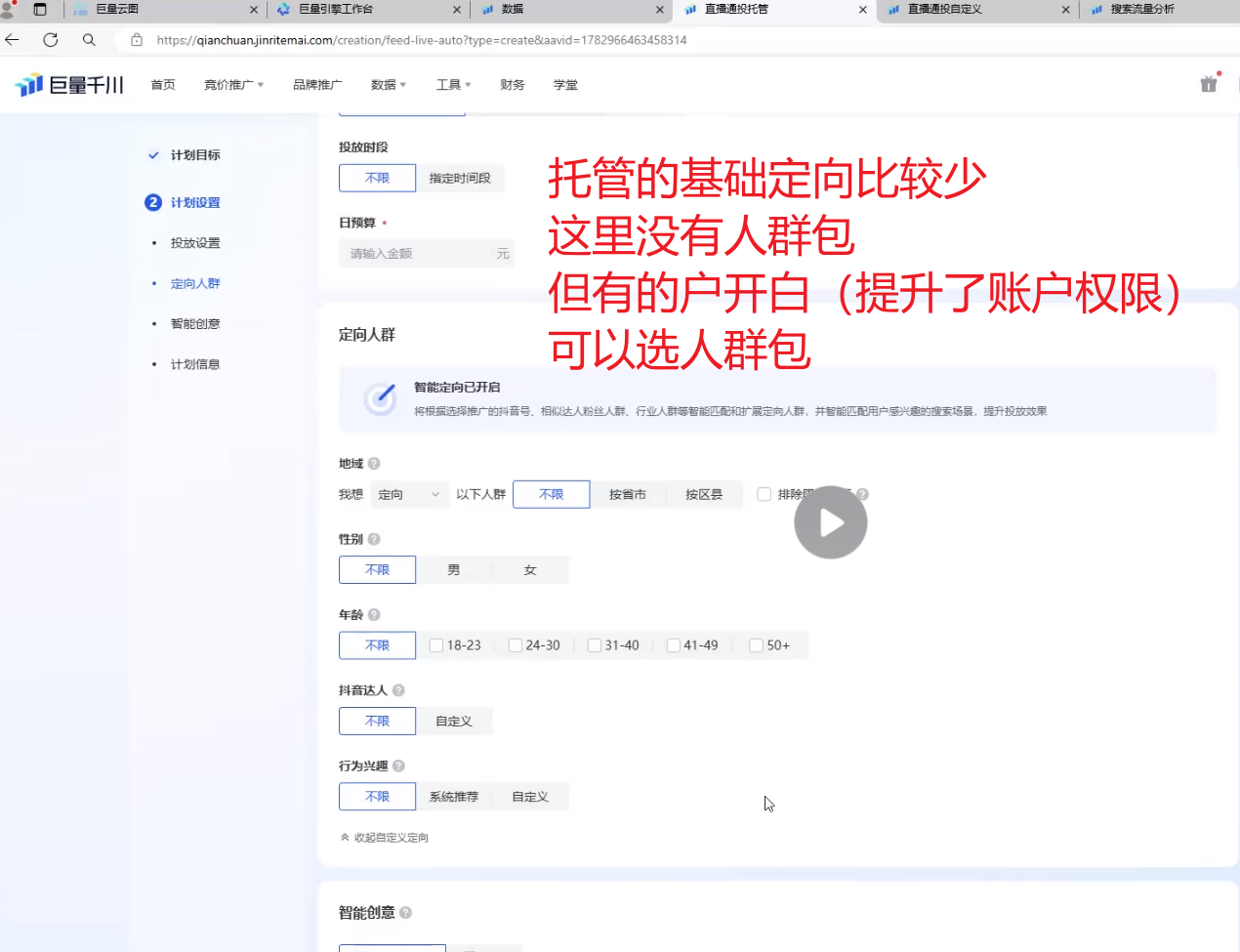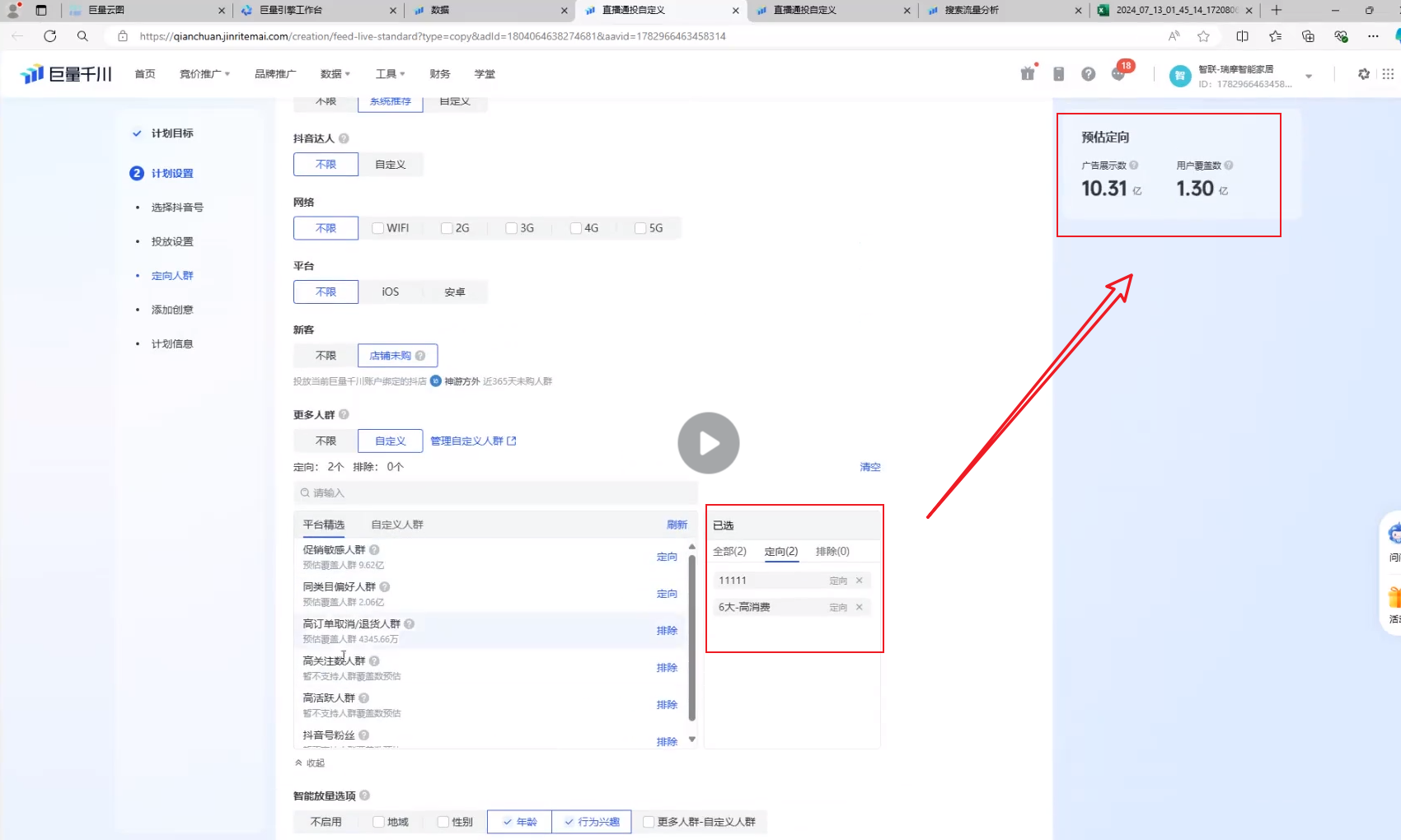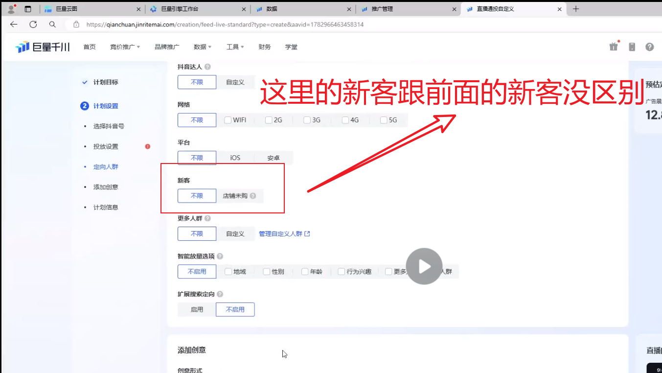 出价,后续会详细讲,右边是平台给出的参考,不一定要按照这个,看你直播间具体数据情况而定