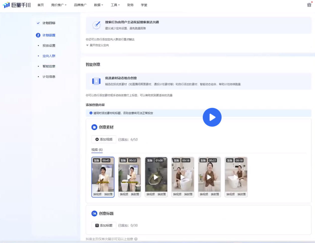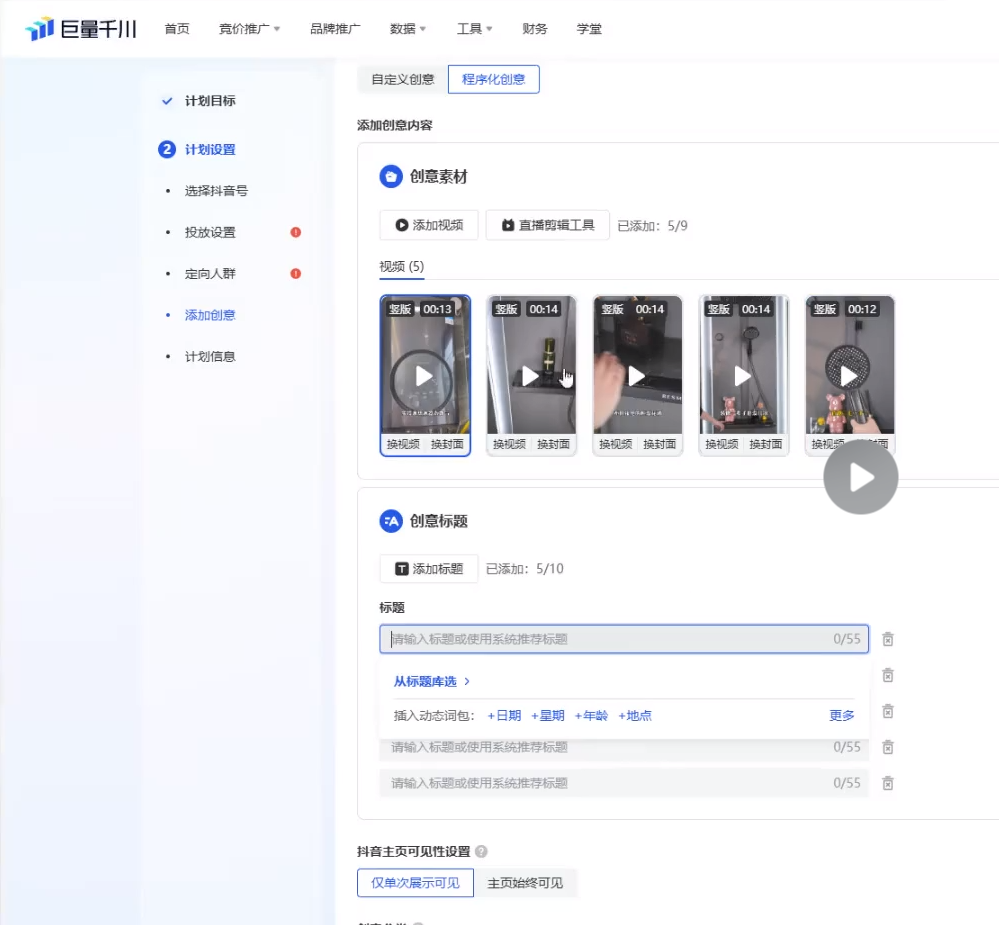 添加创意中,直投就直接投直播间画面,投素材则选视频。视频的创意类型有两种:自定义创意和程序化创意(二者的区别)