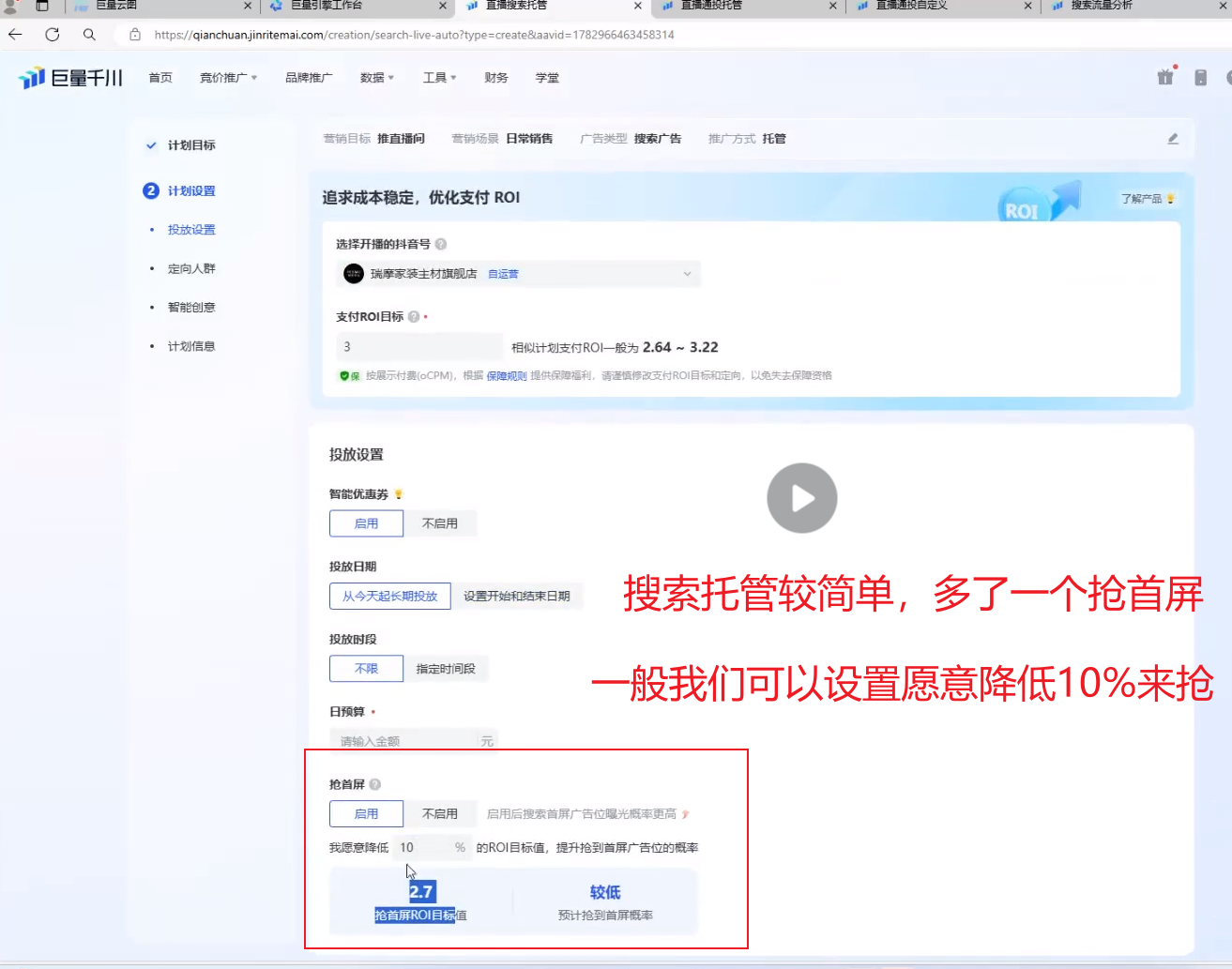 抢首屏,降低值控制在 10-15%都可以,不要让支付 ROI 目标与降低后相差太多就行。如果平常跑 ROI:3,今天设置高点,调到 3.3 或 3.4,那么降低值可设置到 20%