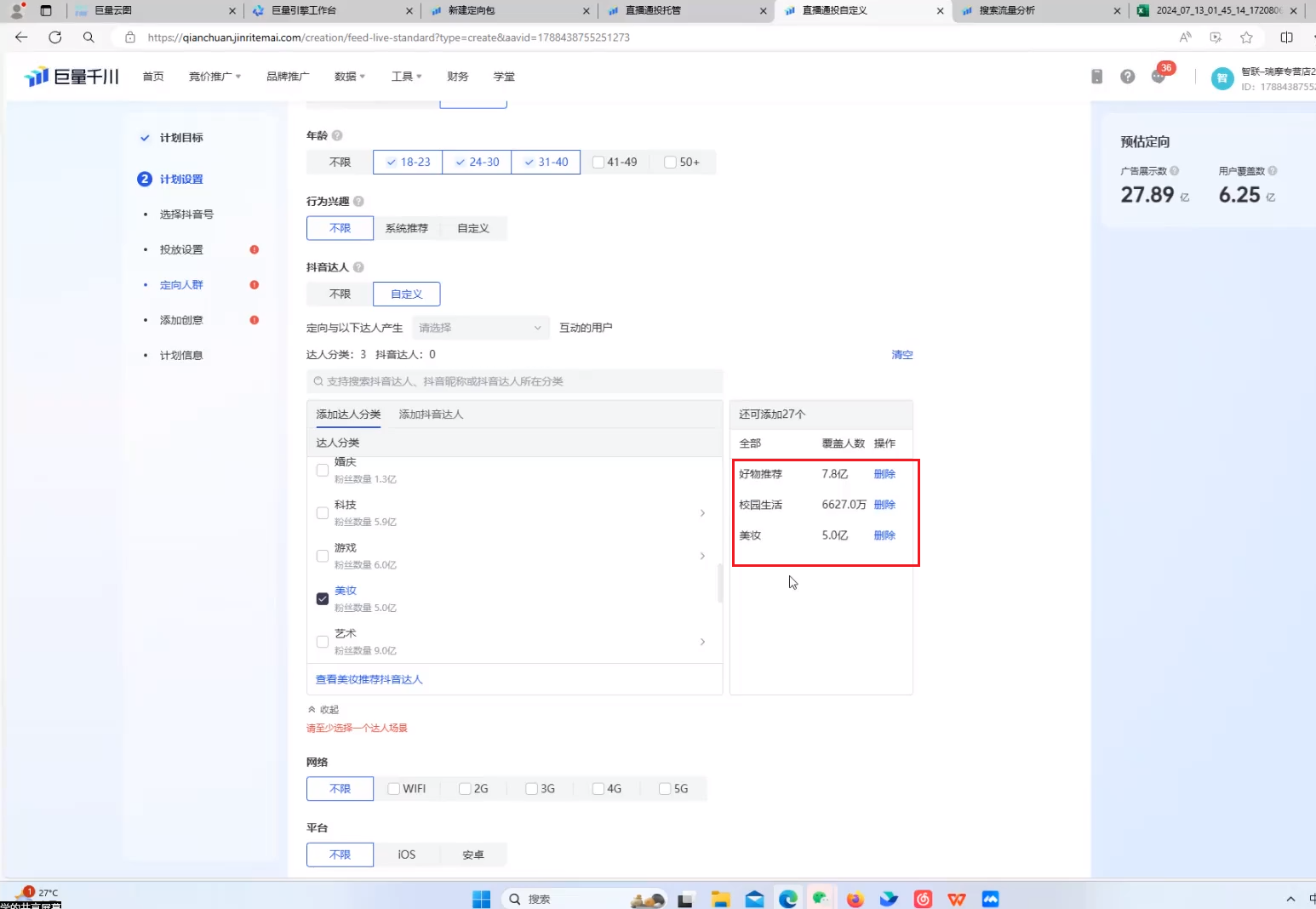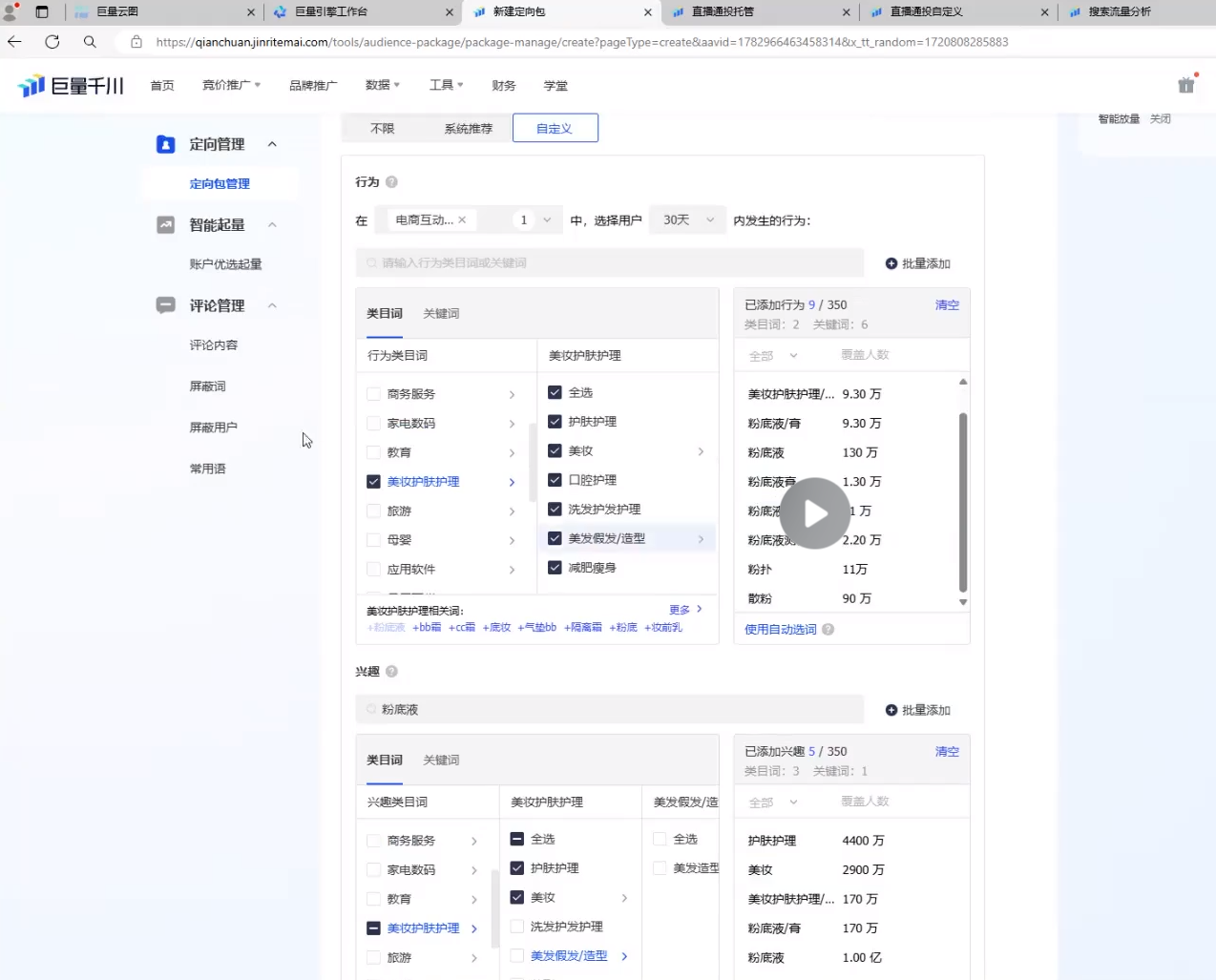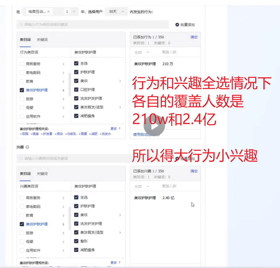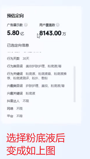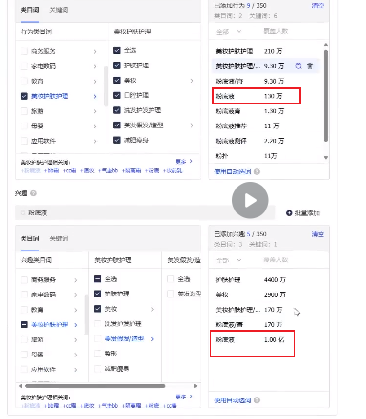 功效词(不卡粉、美白、磨皮等)在行为里选,不在兴趣里选。兴趣只选类目词和产品词,不然选了功效词覆盖范围太大了